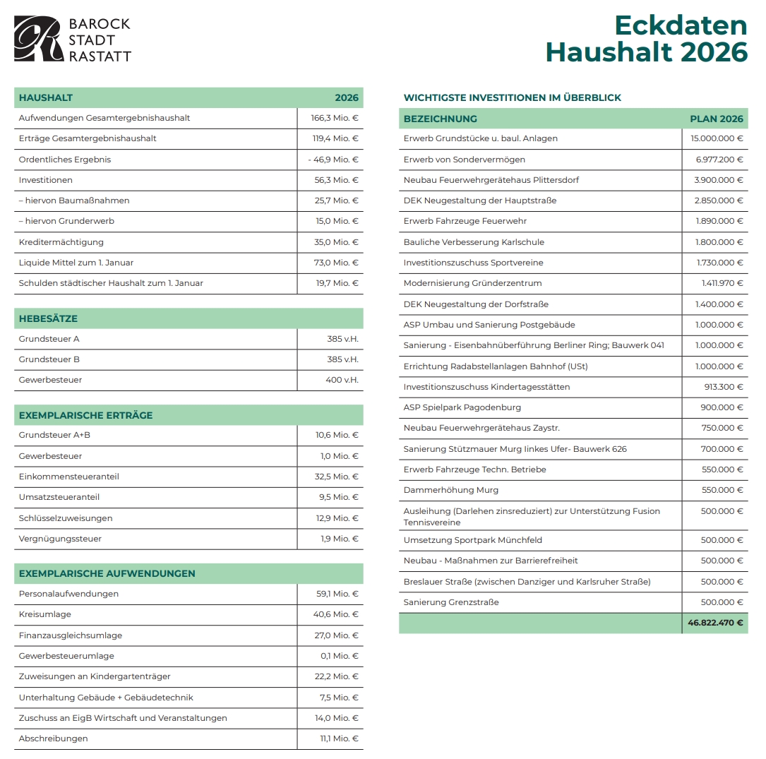 Der Rastatter Haushaltsplan 2026 steht hier zur Ansicht zur Verfügung. Zum Haushaltsplan 2026 (PDF) (18,6 MB)