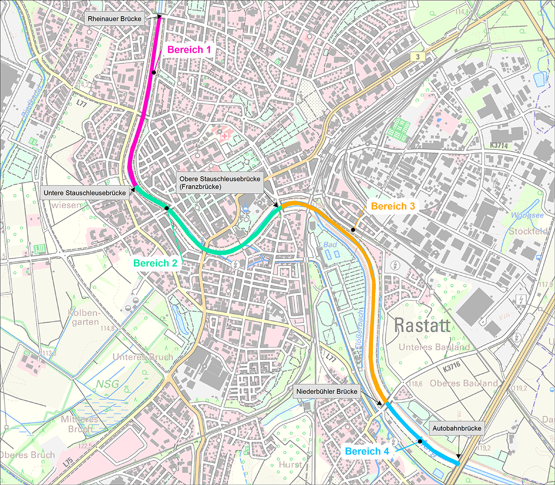 So unterschiedlich das Bild der Murg in dem Projektgebiet ist, so unterschiedlich sind die Anforderung an die Hochwasserschutzmaßnahmen. Um die unterschiedlichen Anforderungen möglichst gut abzubilden, wurde das Projektgebiet in circa 50 Unterbereiche aufgeteilt. Auf diese Weise können für jeden Unterbereich die optimalen Maßnahmen für den Hochwasserschutz festgestellt werden.
